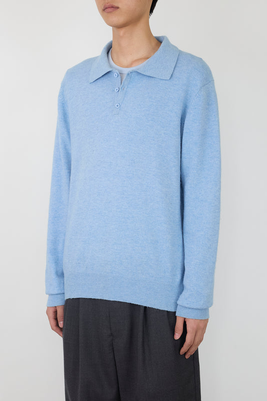 VINTAGE SKY BLUE WOOL CASHMERE KNIT POLO SHIRT MADE IN ITALY