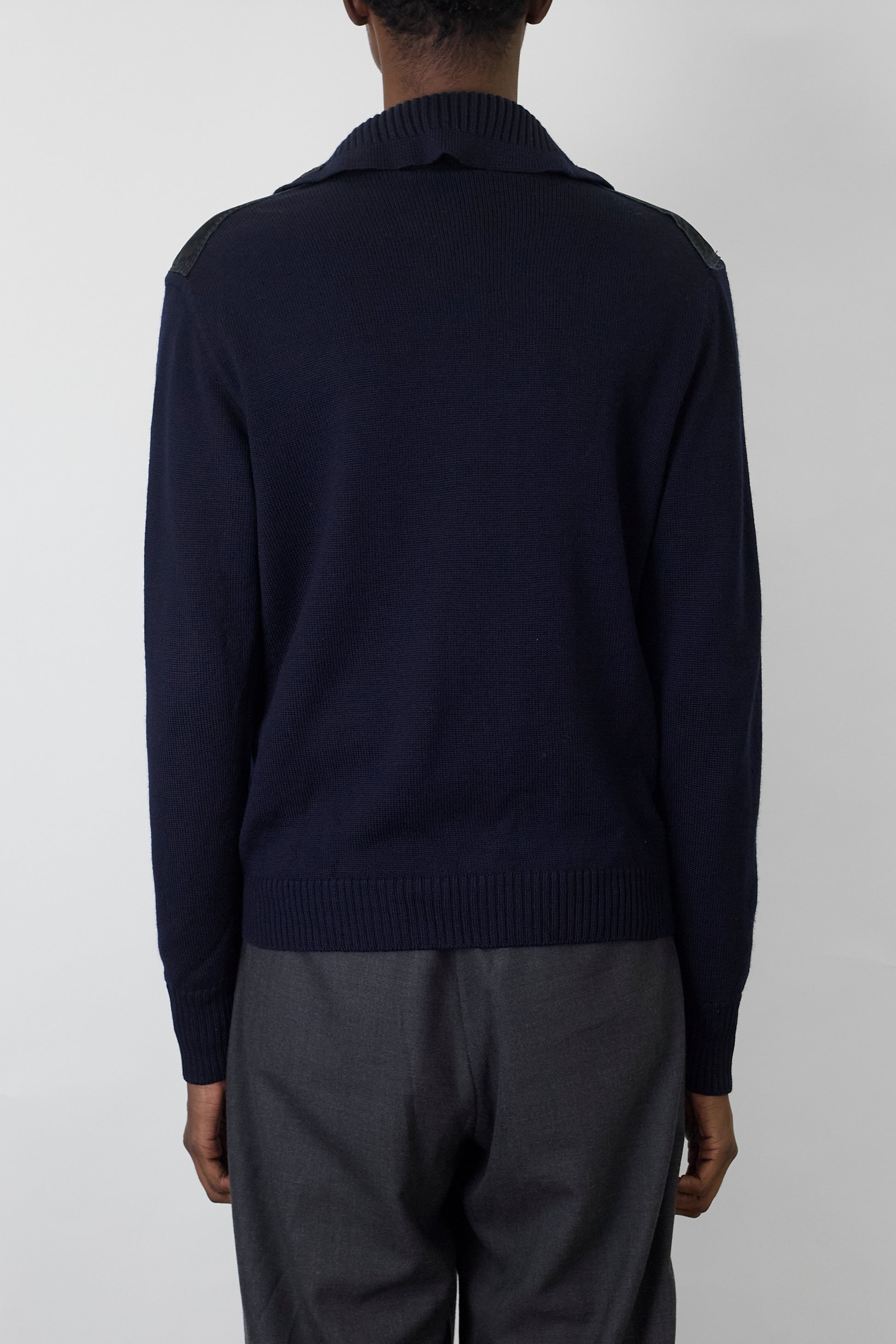 VINTAGE NAVY LEATHER WOOL ZIP UP KNIT MADE IN ITALY